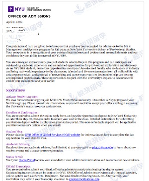 吴同学 毕业院校:国内双非院校 录取国家:美国 录取院校:纽约大学 录取专业:MS in Management and Systems (管理与系统硕士)